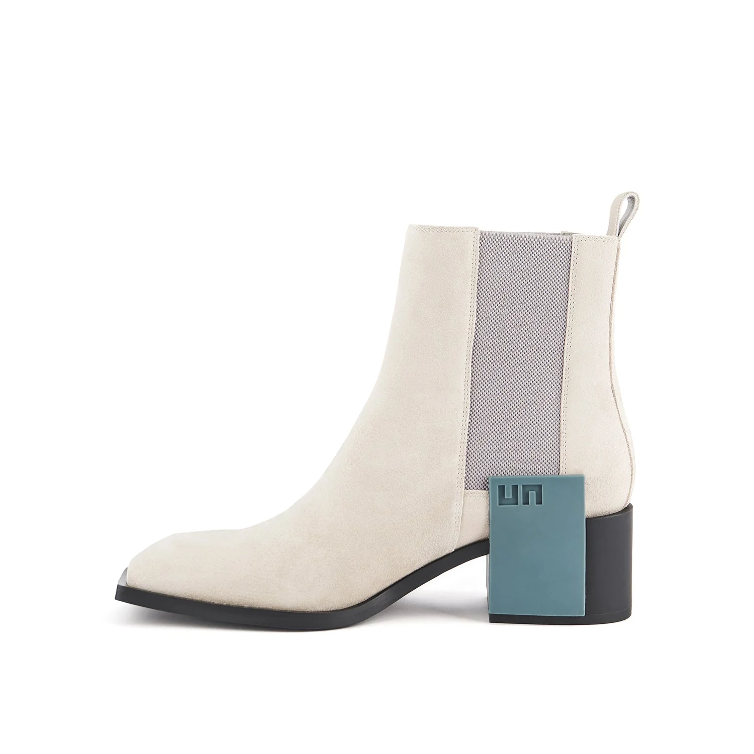 The Jimmy Chelsea Mens is a pull-on mid-heel boot with a nappa leather upper, an angular toe, and a statement logo block.