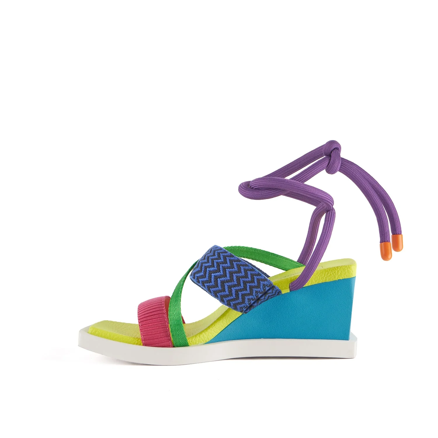 The Ko Craft Mid is a strappy sandal featuring an ankle tie with metal aglets, a silicon-printed elasticized strap, and a square-shaped block wedge with a subtle textured finish.