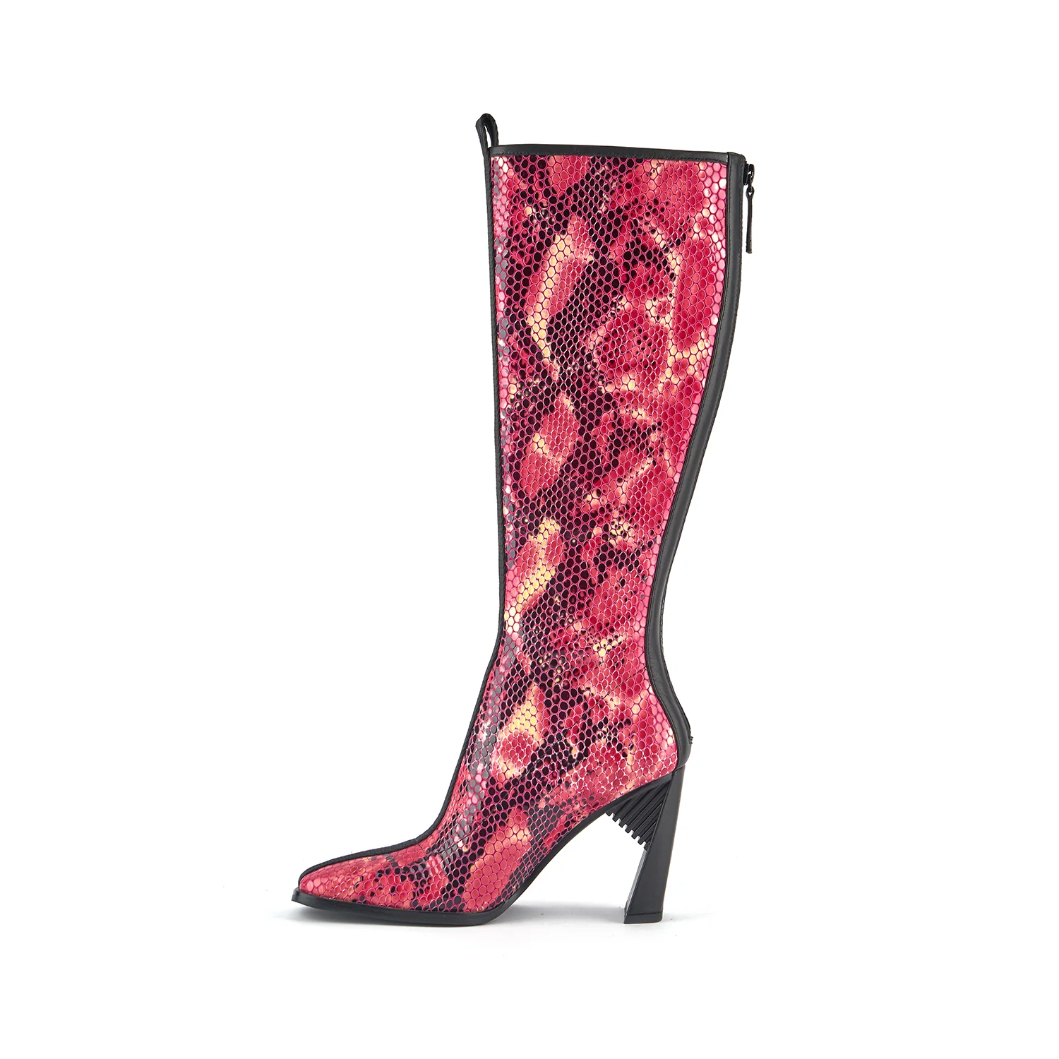 The Sonar Boot Hi is a sleek, knee-high boot with a unique heel profile, a soft almond toe, and a limited edition python-embossed leather upper made in collaboration with celebrity stylist, Janelle Miller.