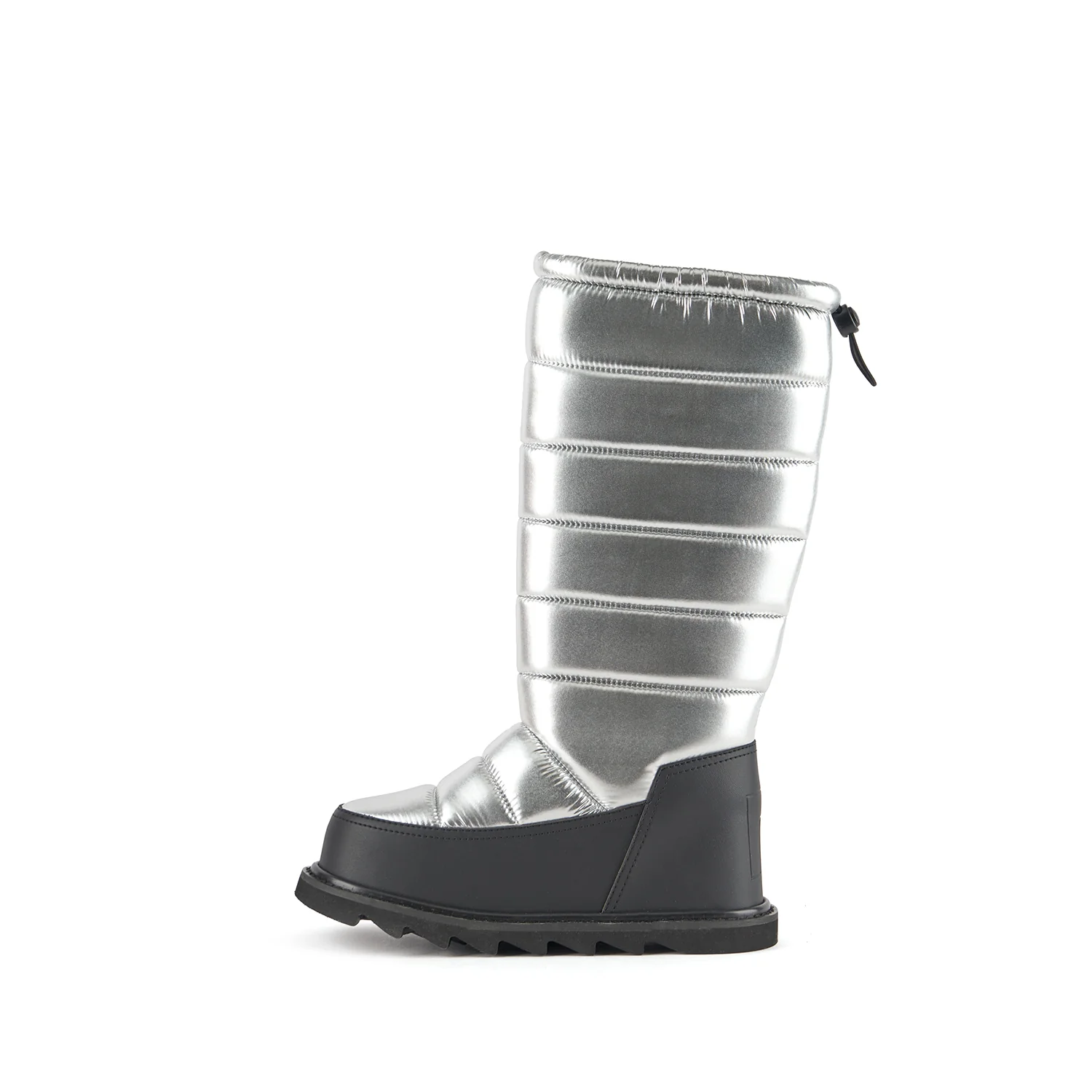 The Zembla Bubble Boot is a pull-on winter knee boot featuring a quilted puffer upper, an oversized rand, an adjustable topline, and a chunky treaded platform outsole.